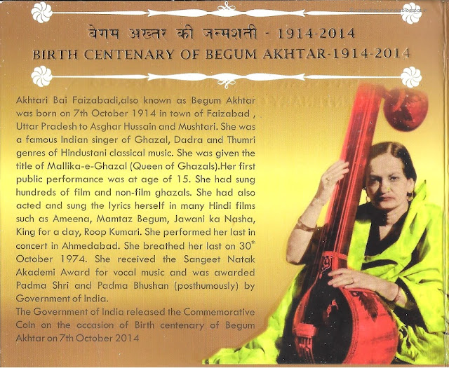 Akhtari Bai Faizabadi, also known as Begum Akhtar (7 October 1914 – 30 October 1974), was a well known Indian singer of Ghazal, and Dadra, and Thumri genres of Hindustani classical music.