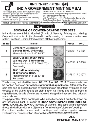 Mumbai Mint has come up new booking. The Bookings are for Banaras Hindu university Coins. They are open from 14-Nov-2016 to 14-Jan-2017
