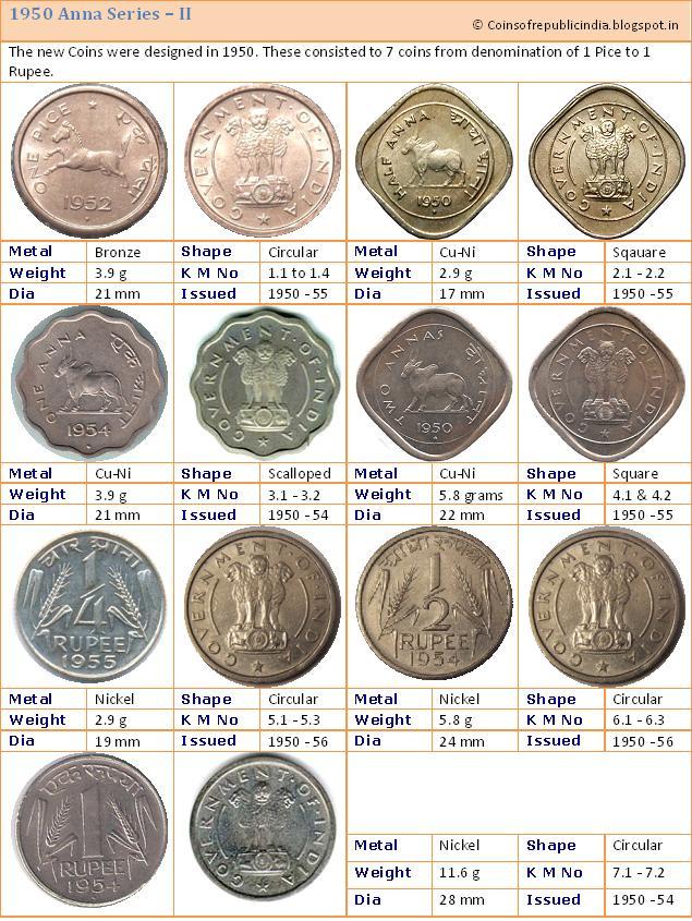 From 1947 to 1950, the older coins of pre-independence were still valid. This represented the currency arrangements during the transition period up to the establishment of the Indian Republic. The Monetary System remained unchanged at One Rupee consisting of 192 pies.- 1 Rupee = 16 Annas
